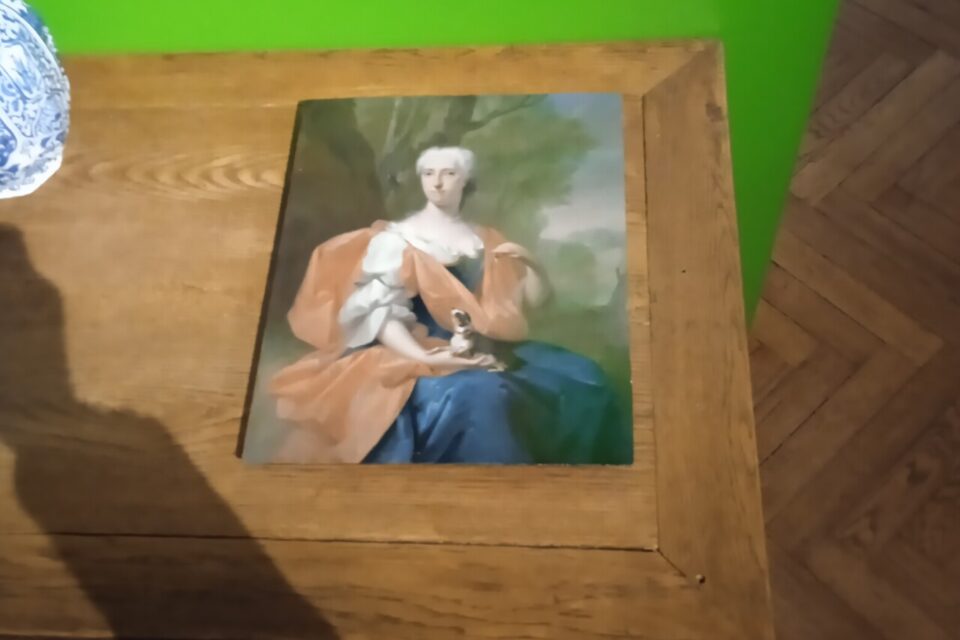 L’huile sur toile intitulée La dame de qualité, un tableau datant, selon Cédric Pannevel, de 1750, a été réalisée par un artiste peintre anonyme.