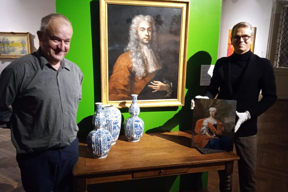 Frédéric Moy, président de l’AAML, et Cédric Pannevel, directeur du musée, présentent les œuvres restaurées : les trois faïences et le portrait de La dame de qualité viennent rejoindre le Portrait d’un Magistrat restauré, lui, en 2022 ©La Dépêche de Louviers